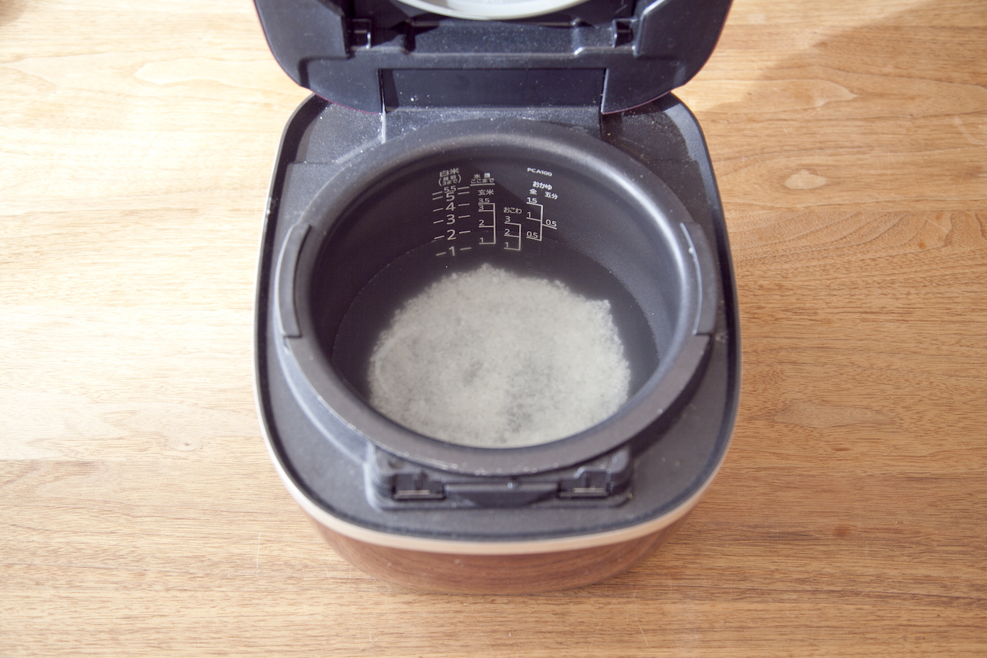 米を研いで炊飯器に入れ、おかゆ1/2合の線まで水を入れる。
