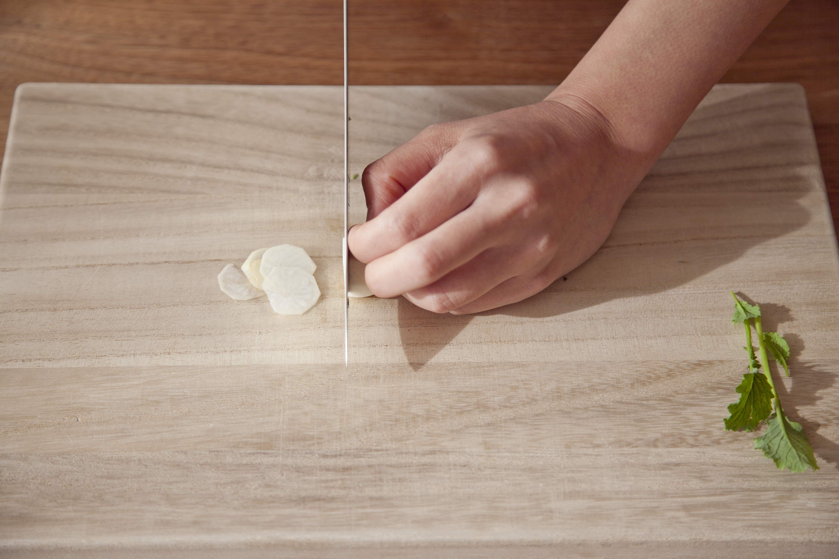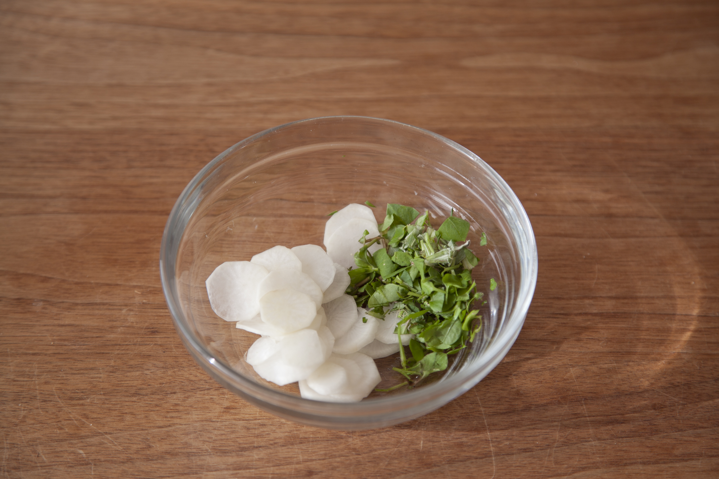 すずな、すずしろの実は皮をむき厚さ2〜3mmの輪切りにする。(大きい場合は半月切りにする)