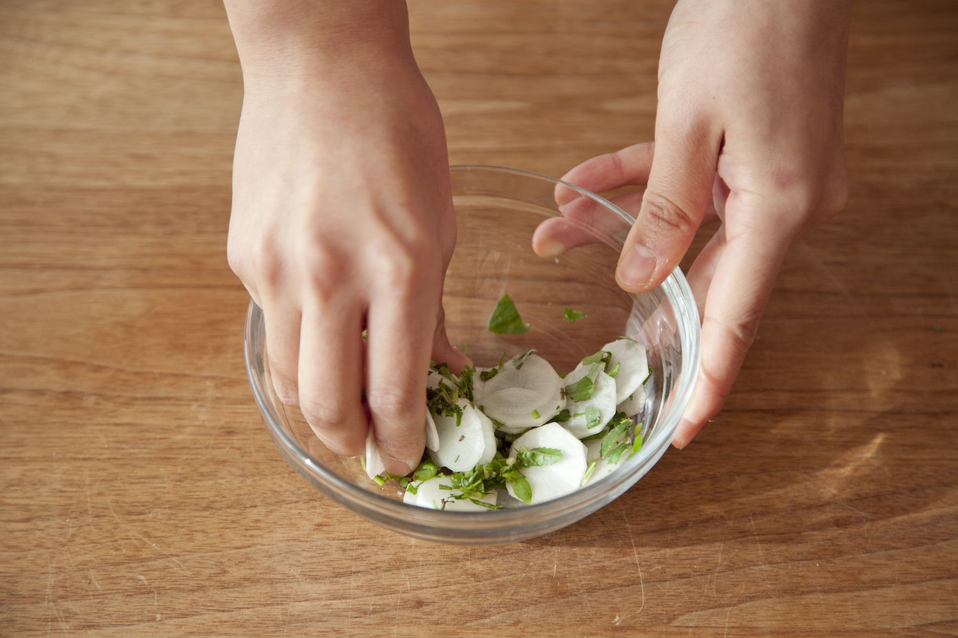 塩(分量外/ふたつまみ程度)を加えて揉む。