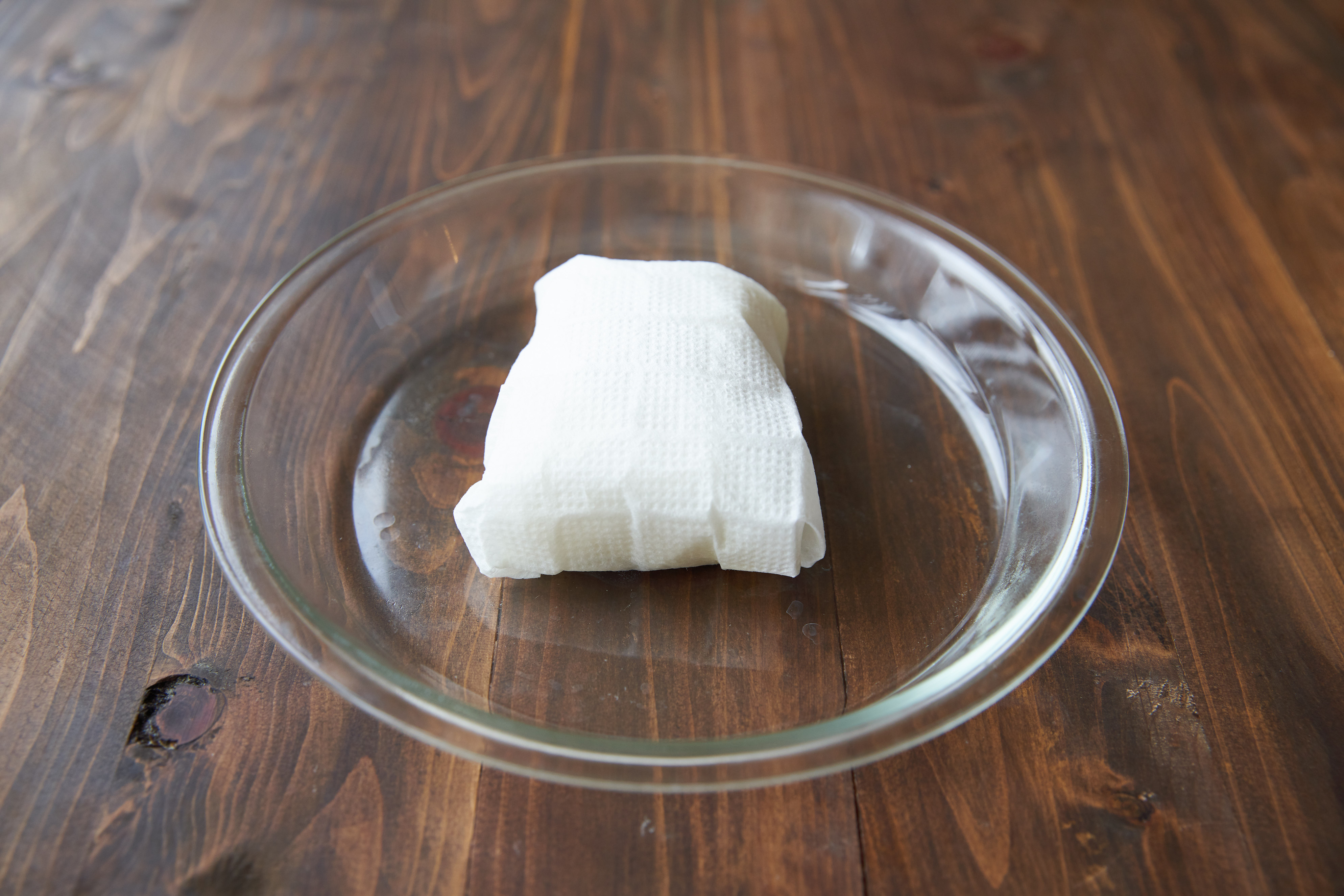 木綿豆腐はキッチンペーパーに2重に包んで電子レンジ600Wで3分加熱して水切りする。