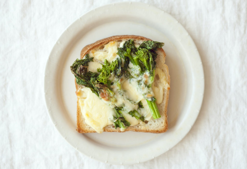 食パンに、ピザ用チーズ、菜の花をのせ、