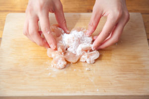 ささみは1cm幅のそぎ切りにして塩こしょう(各少々/分量外)をふり、片栗粉をまぶす。
