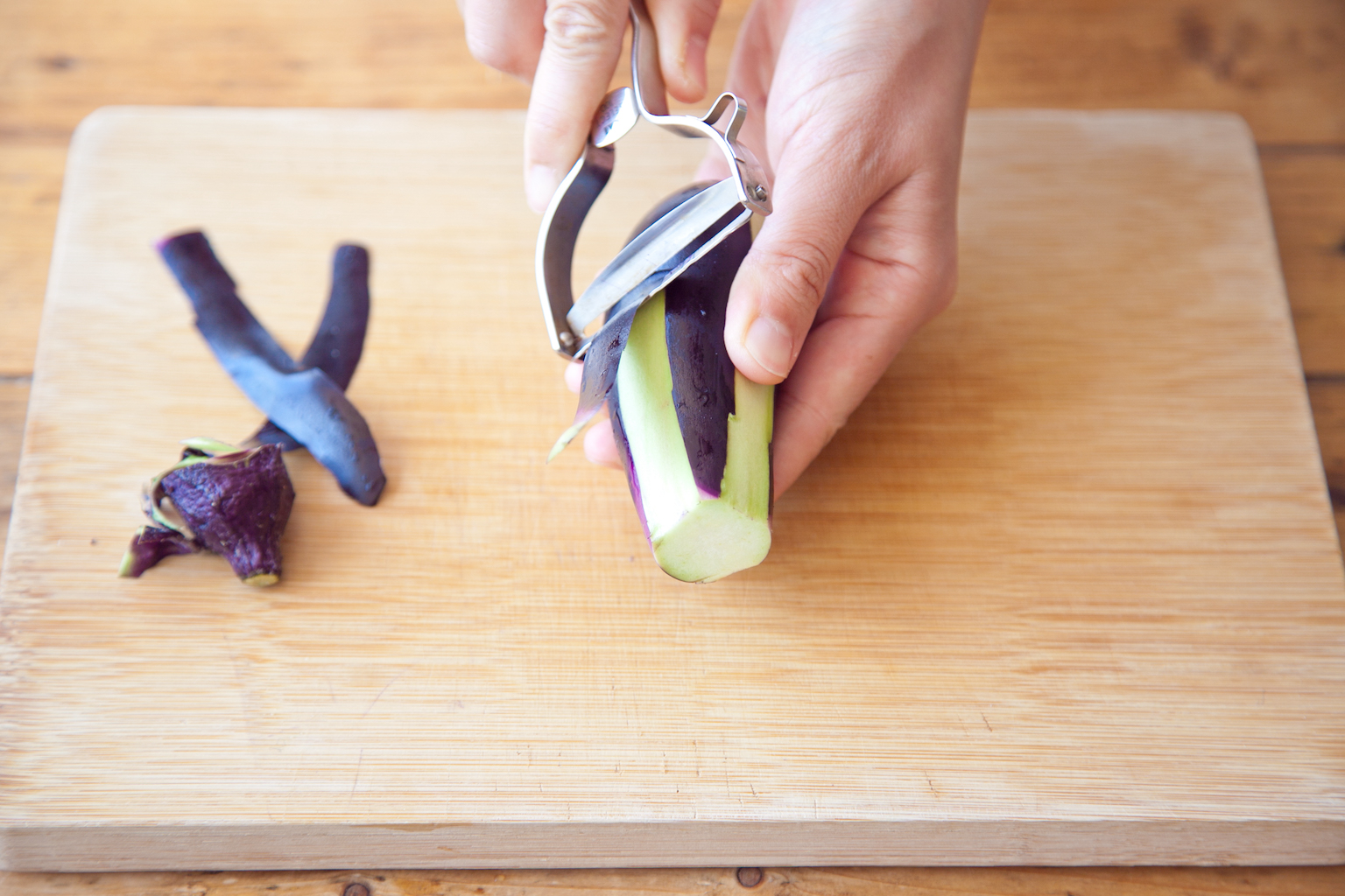 なすはへたを切り落として、しま模様に皮をむき1個ずつラップに包む。