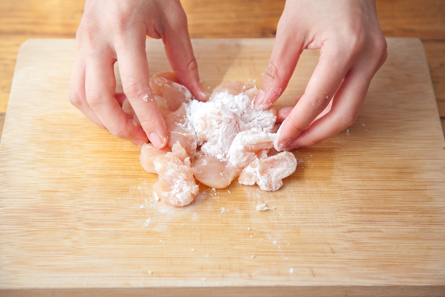 ささみは1cm幅のそぎ切りにして塩こしょう(各少々/分量外)をふり、片栗粉をまぶす。