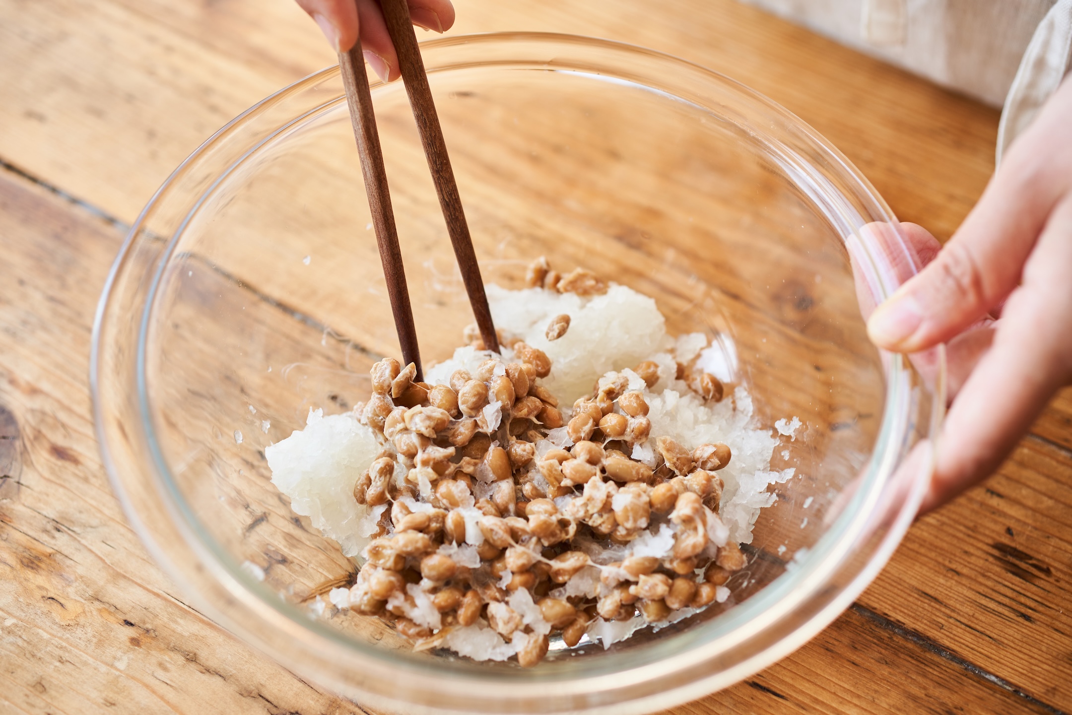 ボウルに大根おろし、納豆を入れて軽く混ぜる。