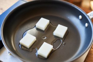 フライパンに米油、もちを入れてを弱めの中火で熱し、