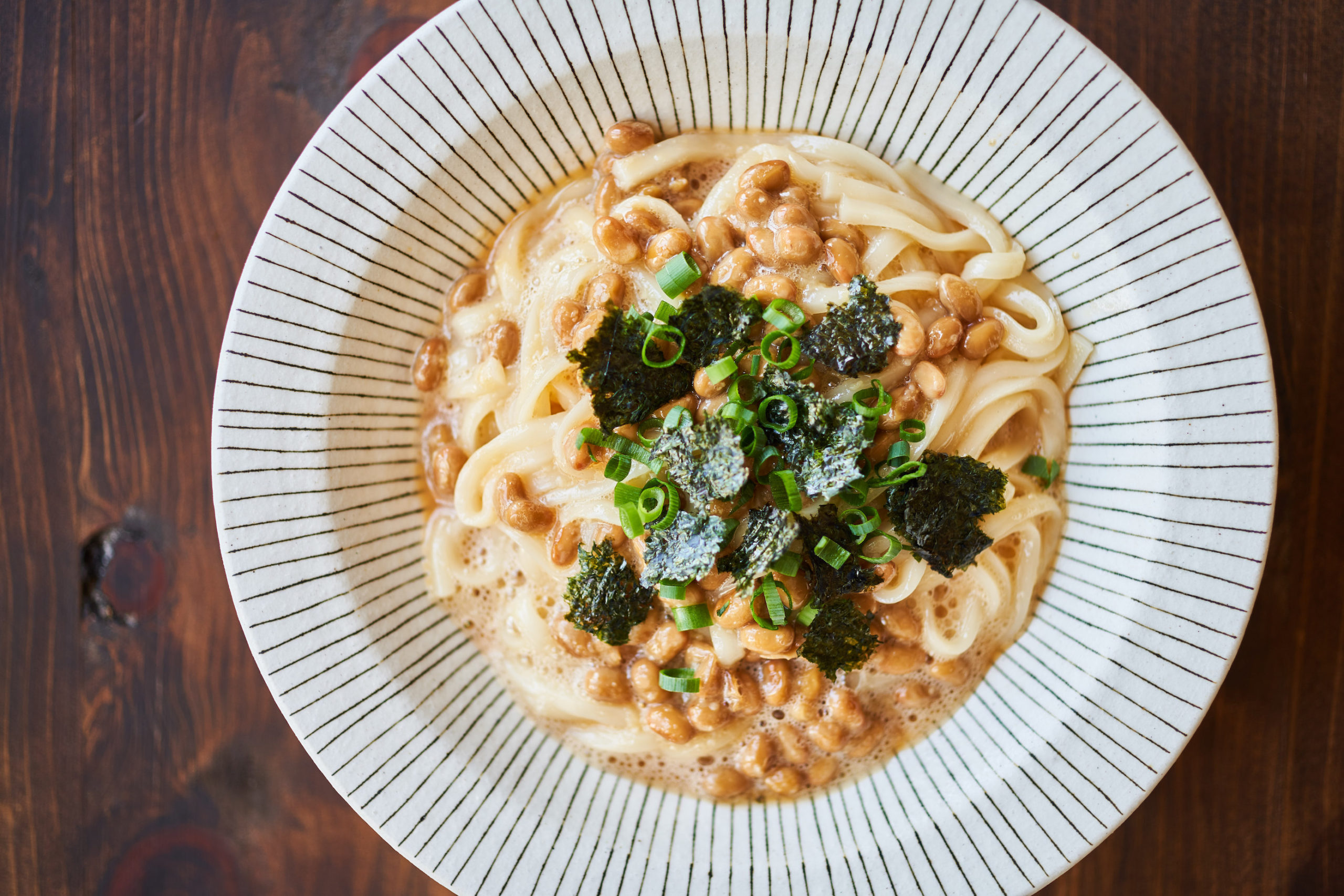 発酵食品、納豆で体にもうれしいカルボナーラうどんです。