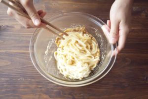 【2】冷凍うどんを袋の表示時間通りに電子レンジで加熱し、