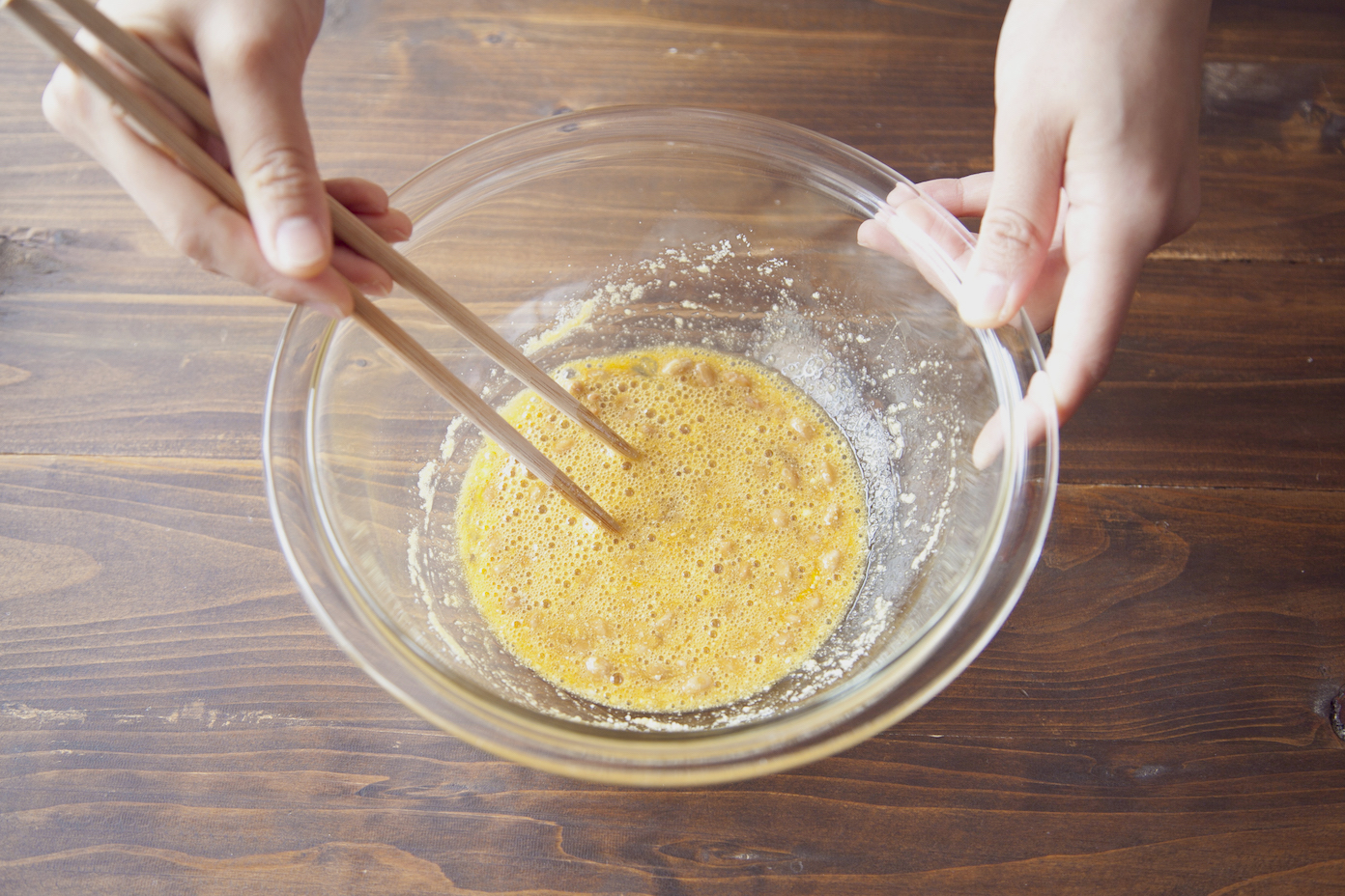 【1】大きめのボウルに卵をよく溶く。(A)を入れてよく混ぜる。