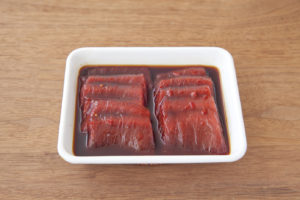 まぐろを厚さ7mm程度の薄切りにし、ラカントS液状、しょうゆ、豆板醤を混ぜた漬けだれに漬ける。