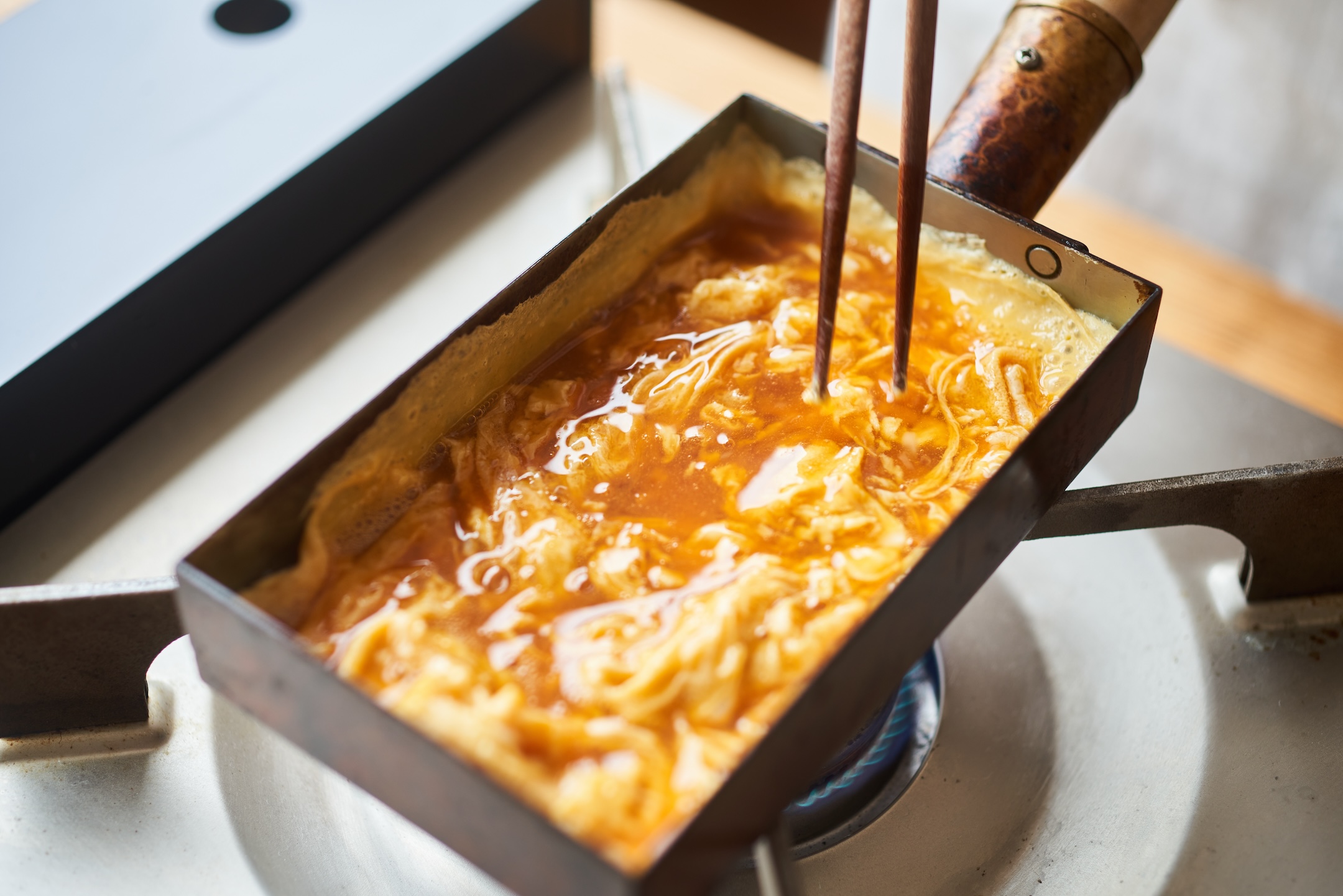卵焼き機(今回は9cm×16cmのものを使用)米油を強めの中火で熱し、卵液の半量を入れて大きく混ぜる。