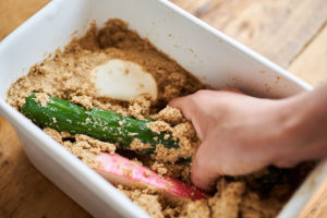 ここからは冷蔵庫の野菜室で保存します。お好みの野菜を漬け込んでください。数日に一回はぬかを混ぜます。