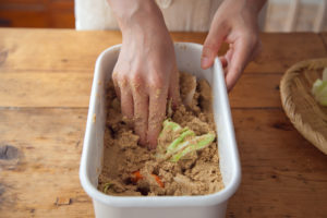 (※漬け野菜を交換するときは野菜を絞って、絞り汁をぬかに混ぜます。)