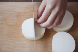 大根は3〜4cm厚さの輪切りにし、皮を厚めに剥き、