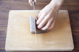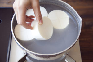 片面に格子状に5mm深さの切り込みをいれ、2〜3分茹でる。