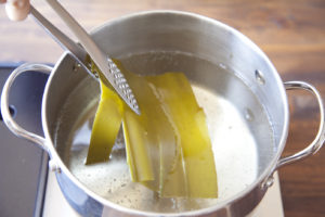 鍋に昆布だしを入れて中火にかけ、沸騰直前に昆布を取り出す。