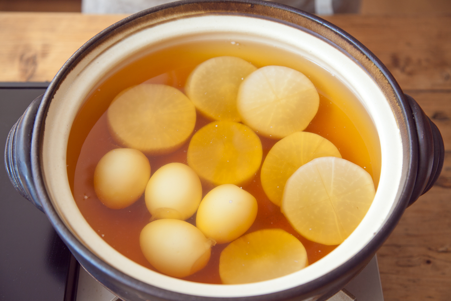 鍋に(B)、2の大根、卵をいれて強めの中火にかける。