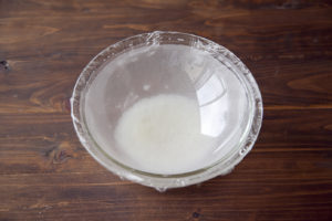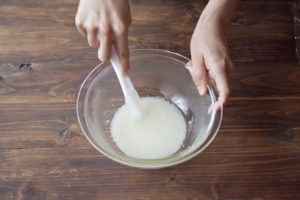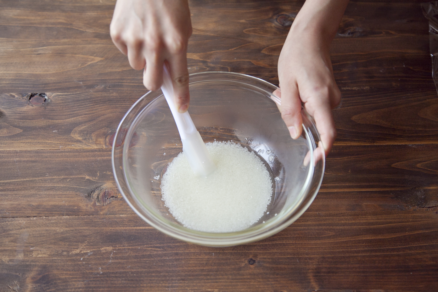耐熱ボウルに熱湯75ml、道明寺粉、砂糖をにいれ混ぜ、