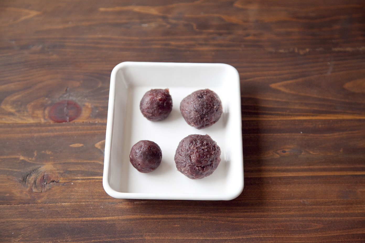 つぶあんを4個に分け、丸める。2個を大きめ、2個を小さめにする。