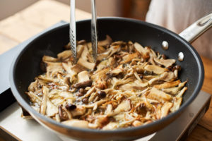 きのこに焼き色がついたら塩を加えて上下を返して、さらに1〜2分焼く。
