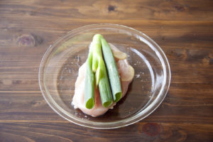 あればねぎの青い部分、しょうがをのせてふわりとラップをかけて、