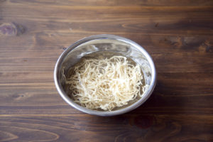 切り干し大根はたっぷりの水に5分浸けて戻し、水気をよく絞る。
