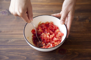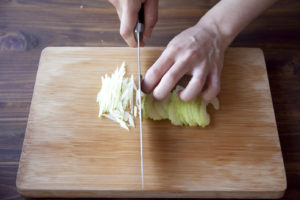 トマトは角切り、きゅうり、セロリは千切りにする。