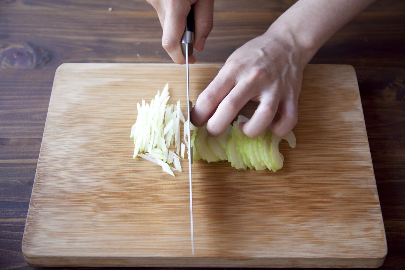 トマトは角切り、きゅうり、セロリは千切りにする。