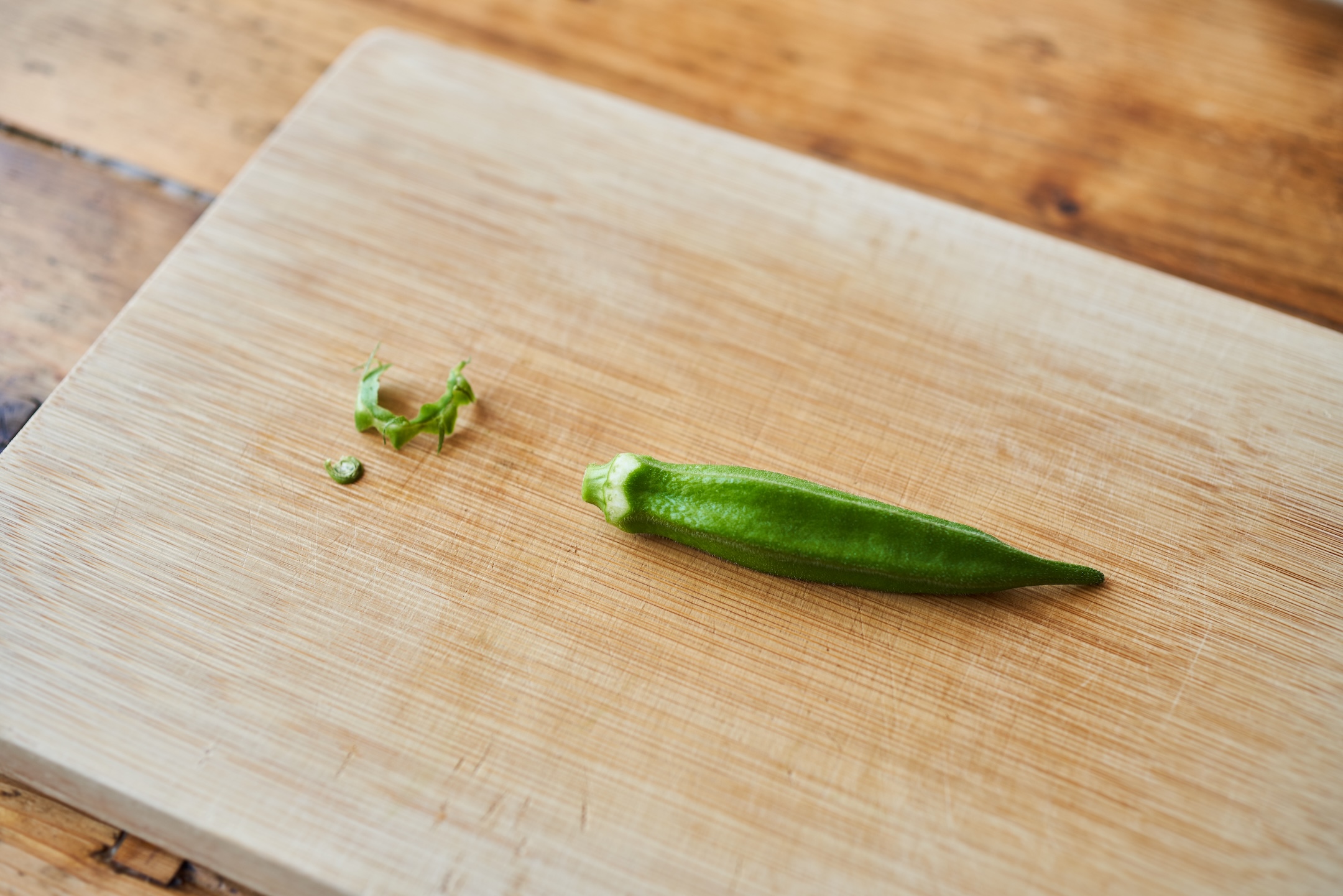 オクラはヘタの硬い部分を切りとり、がくの周りをむく。
