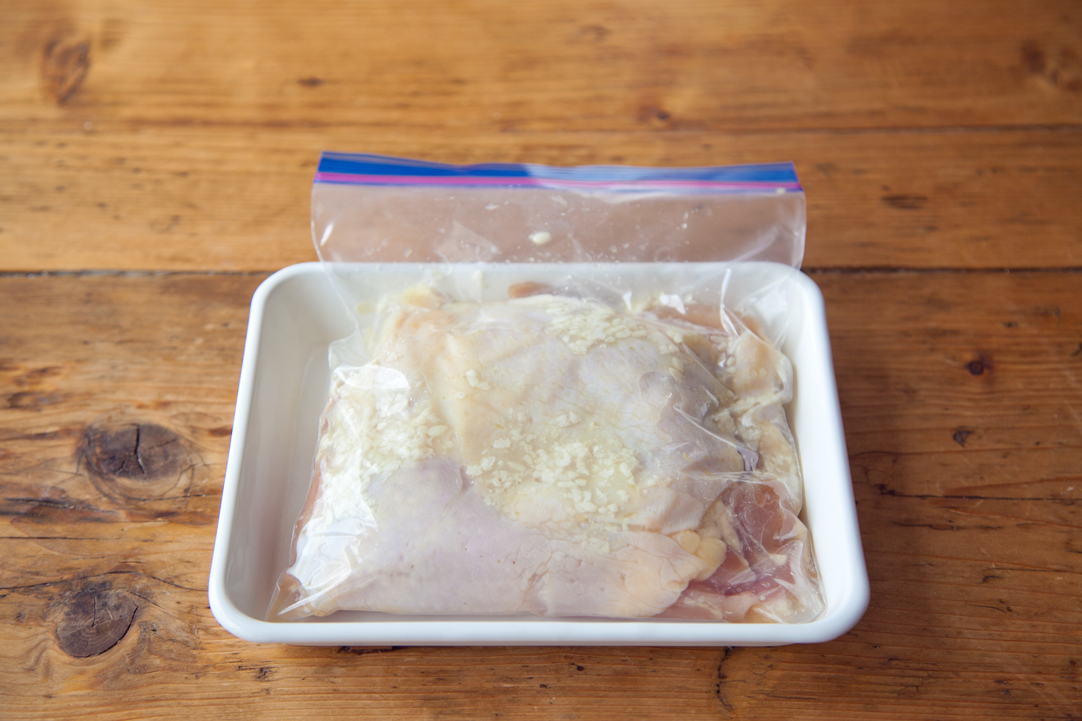 鶏肉は皮目にフォークで穴をあけ、皮目と逆の面の厚い部分に切り込みを入れて保存袋に入れる。