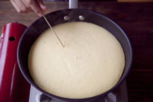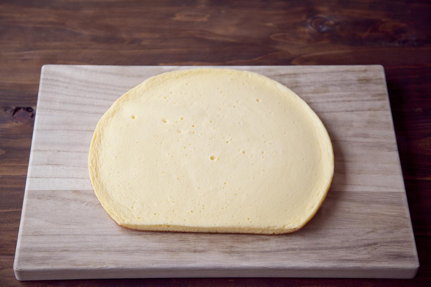 フライパン(直径26cm程度)にサラダ油をうすく広げて熱し、一度濡れふきんの上においてフライパンの温度を均一にする。フライパンをごく弱火にかけ、1を流し入れ、蓋をして13分程度加熱する。