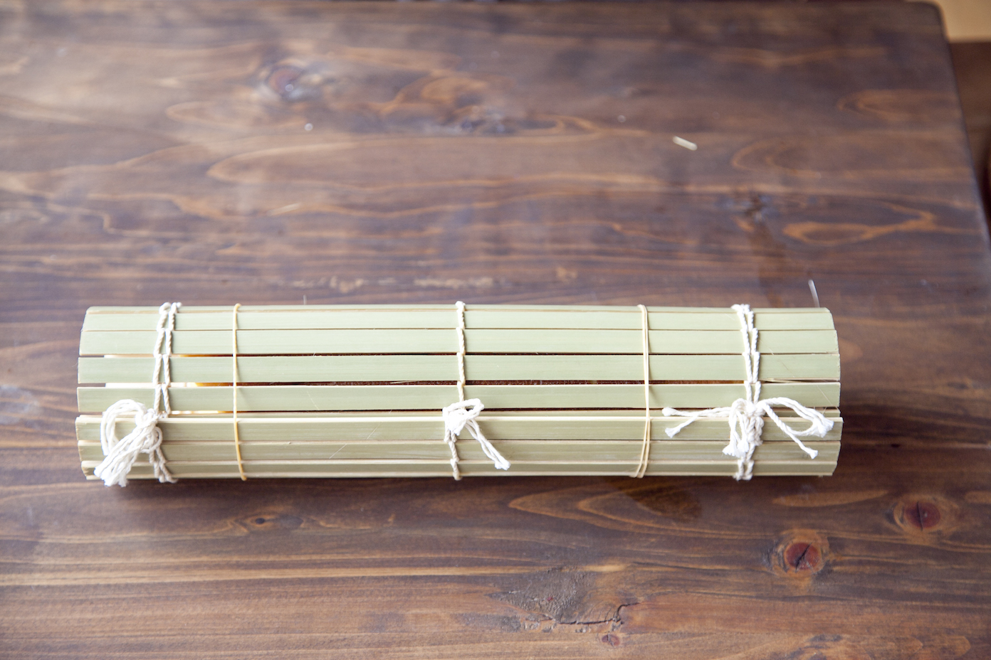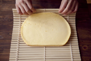 まきす(あれば鬼すだれ)の上に焼き色がない方を上面、切り落とした方を奥側にしてのせ、