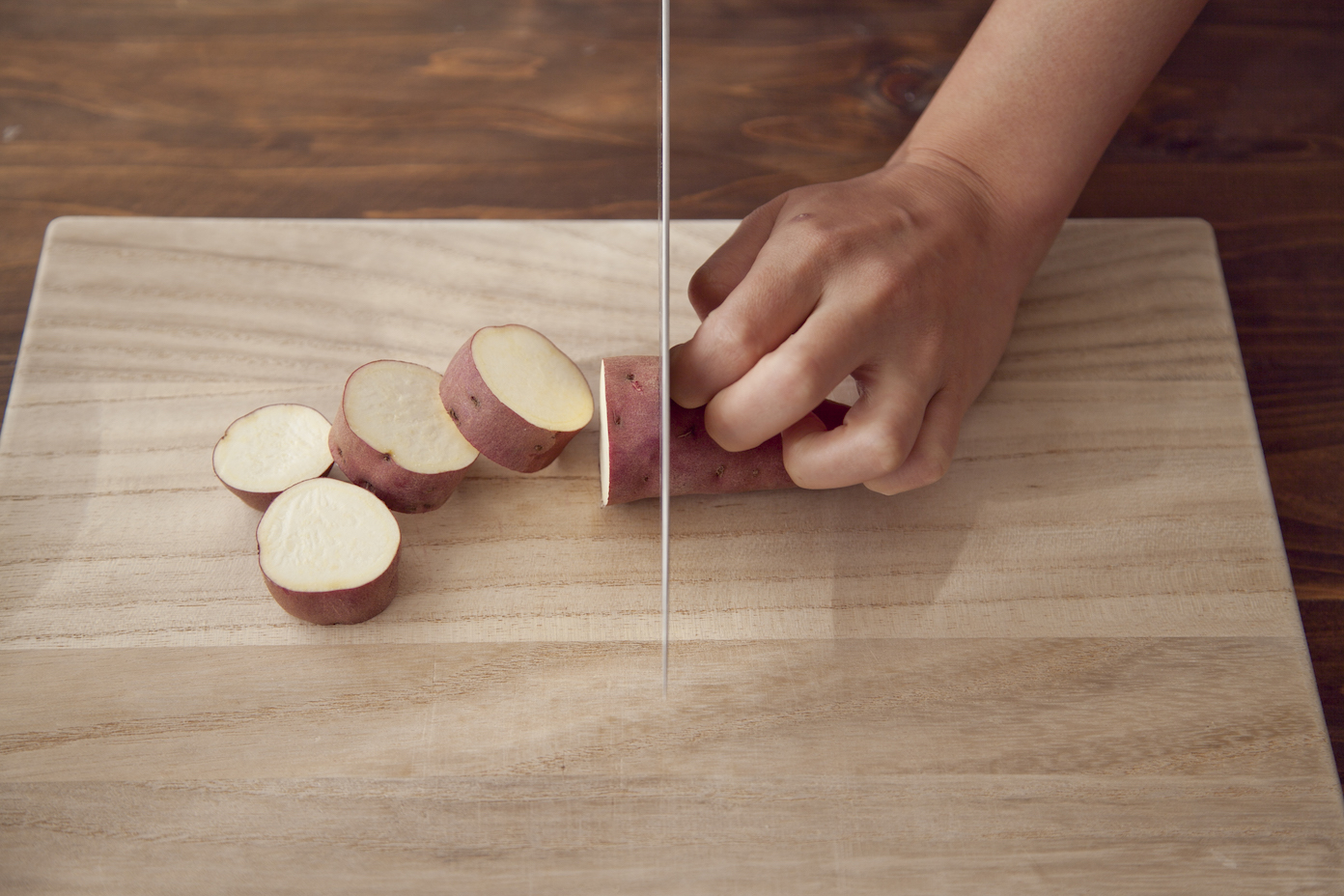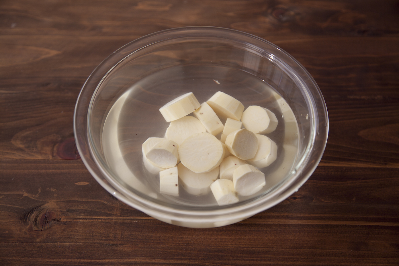 さつまいもは厚さ2cmの輪切りにして皮をむき、水にさらす。