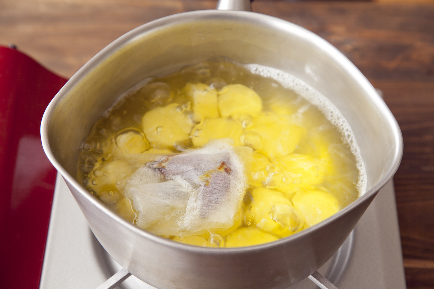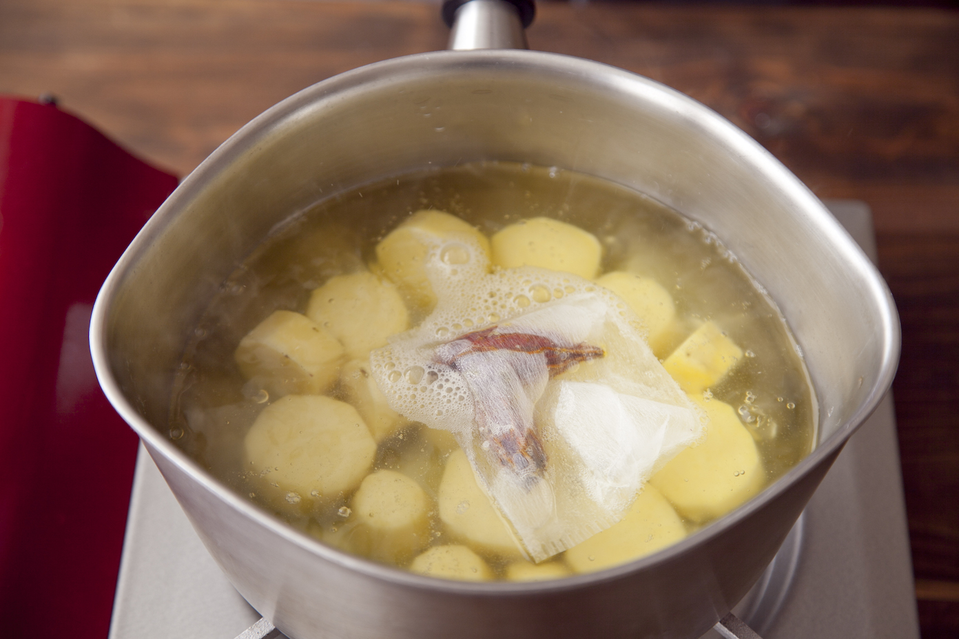 鍋にさつまいも、くちなしの袋、水2カップを入れて強めの中火にかける。
