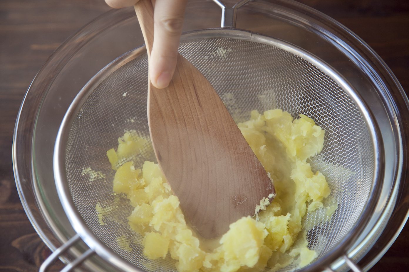 残りのさつまいもはさらに3分煮て、ざるを使って裏ごしする。