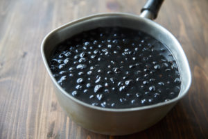 (※煮汁が冷たい状態で黒豆を入れると皮が破れやすいため、温かいうちに黒豆を入れます。)