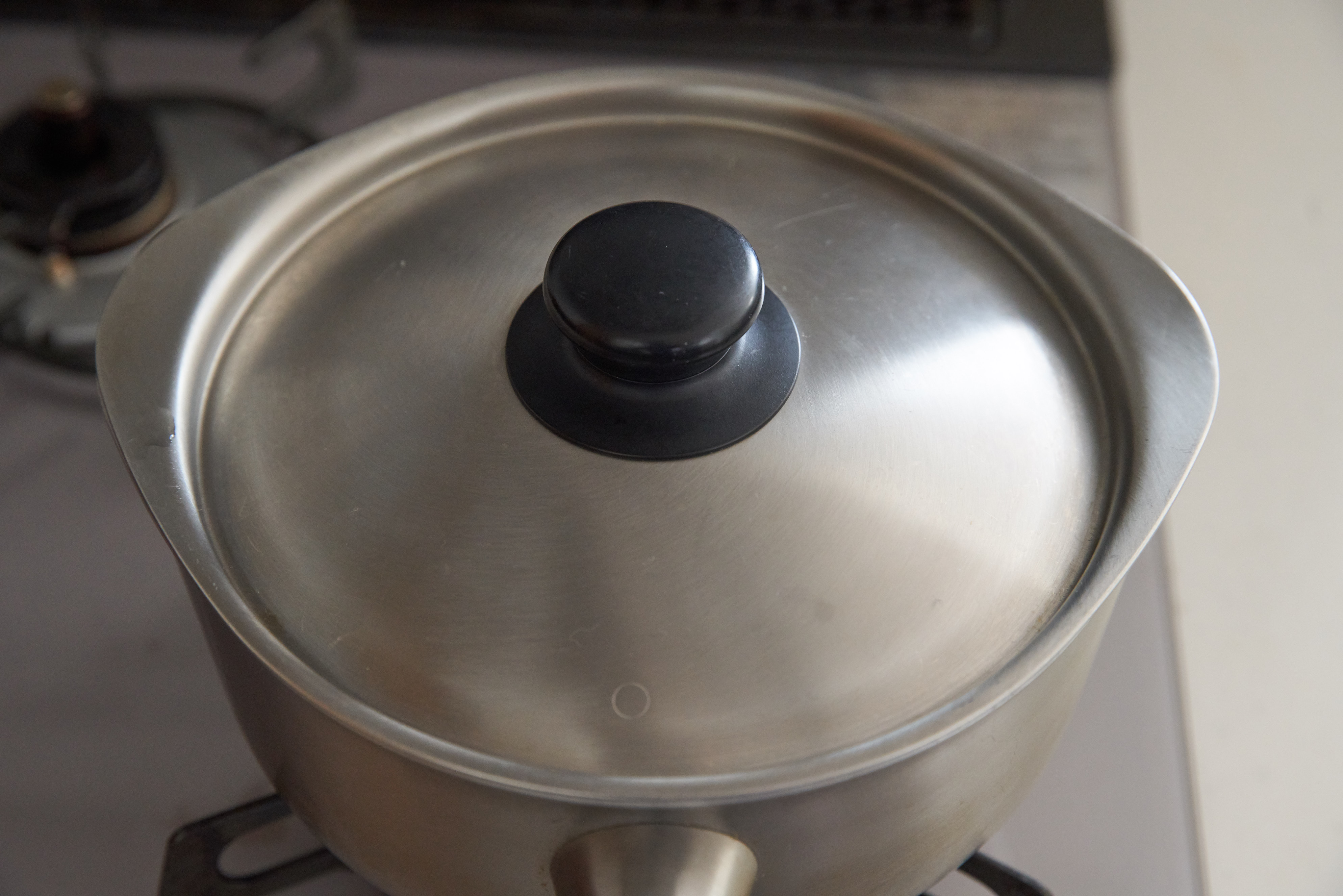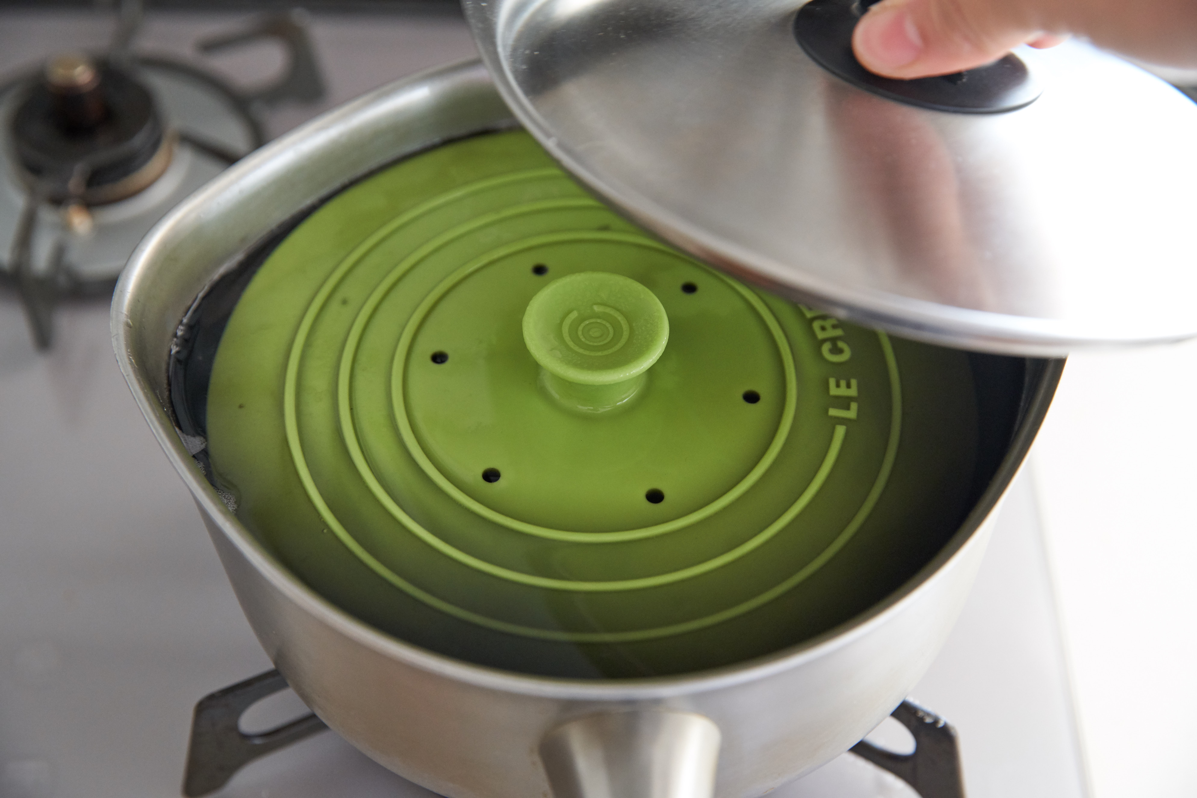 (※空気に触れると皮にしわがよりやすいので、落し蓋、鍋の蓋両方をします。