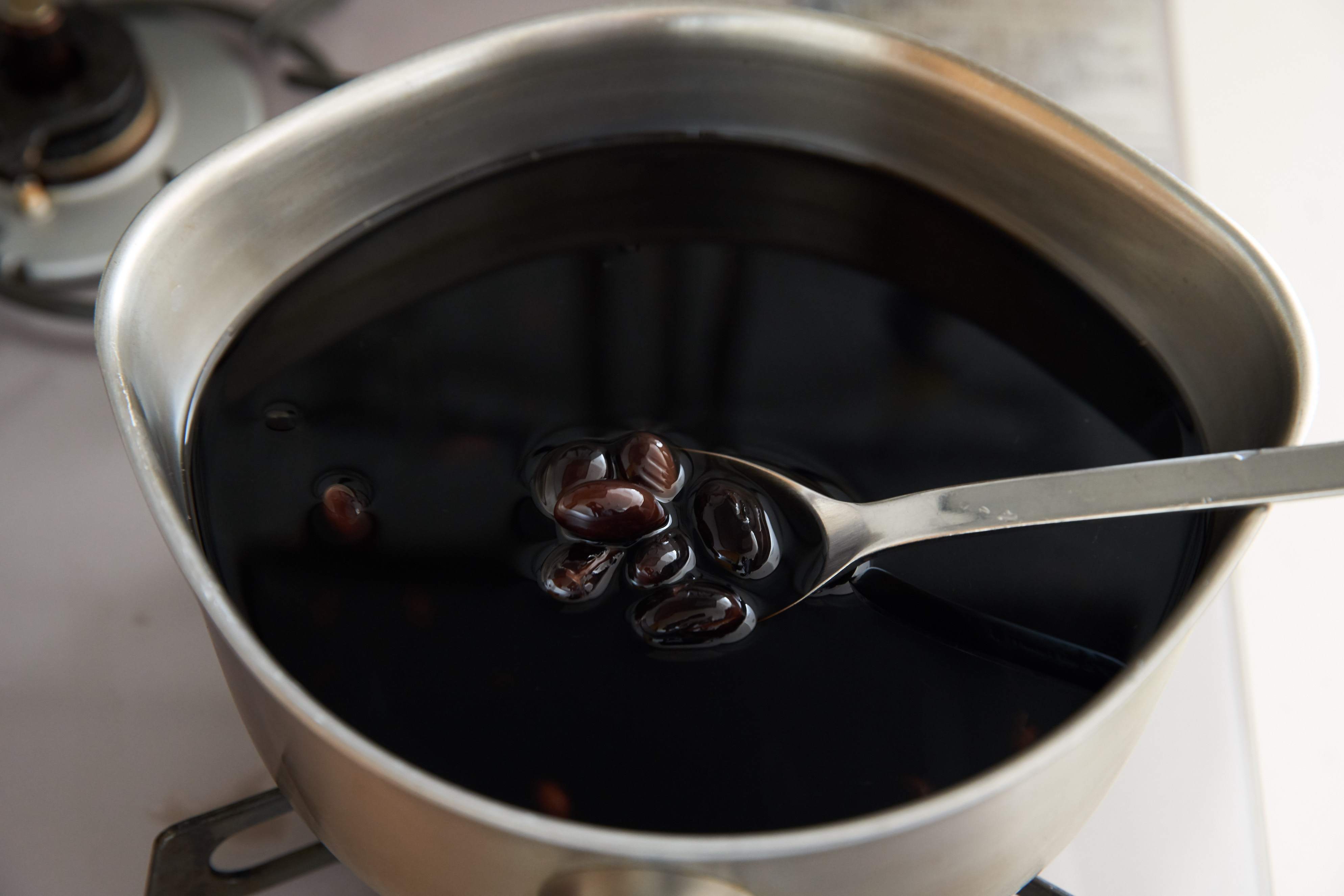 (※煮汁が冷たい状態で黒豆を入れると皮が破れやすいため、温かいうちに黒豆を入れます。)