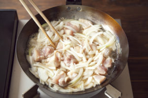 煮たったら玉ねぎ、鶏肉を加え弱めの中火で8分ほど煮る。