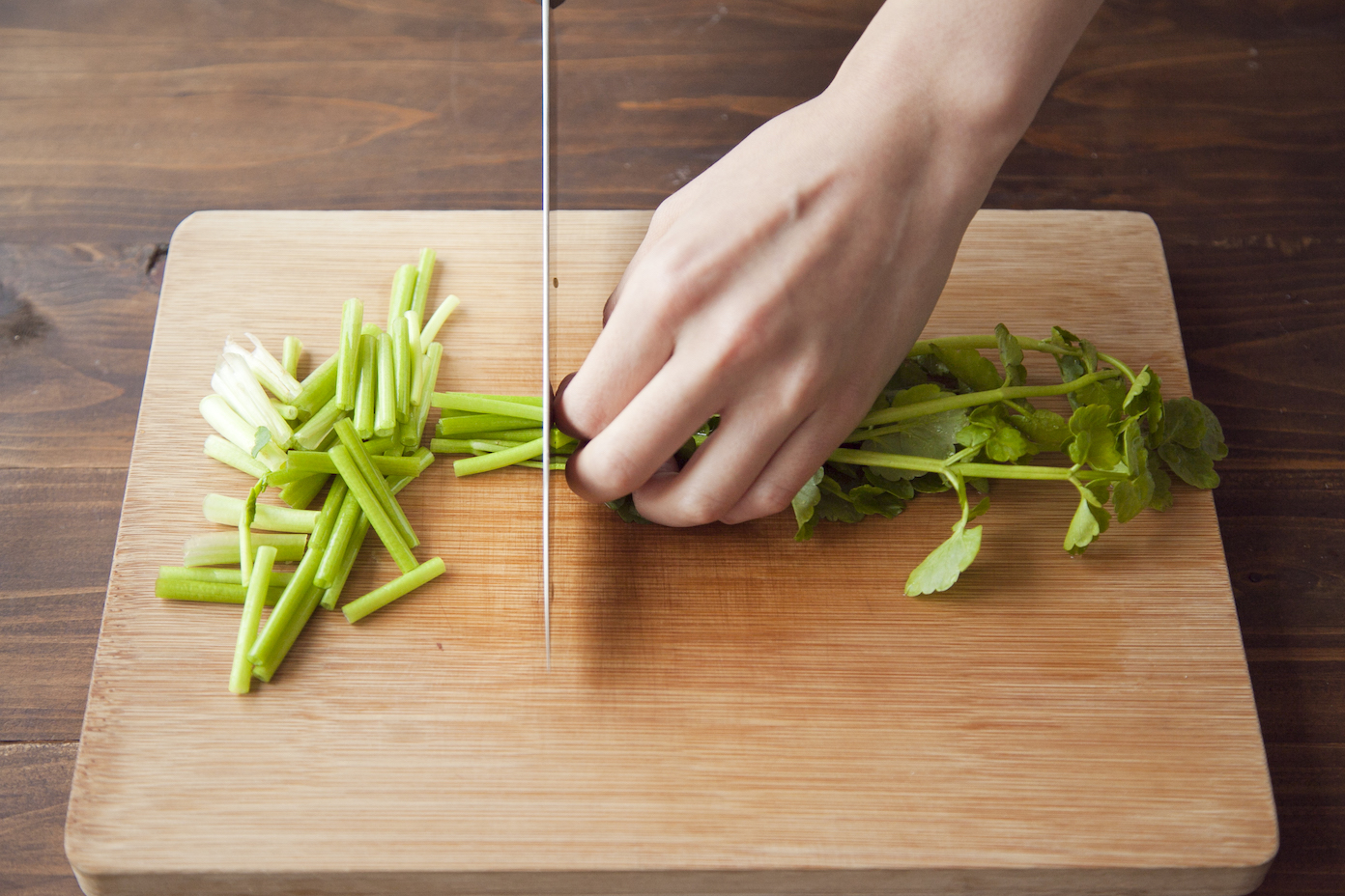 せりは3cm長さ、 玉ねぎは横半分に切って縦薄切りにする。卵は溶いておく。