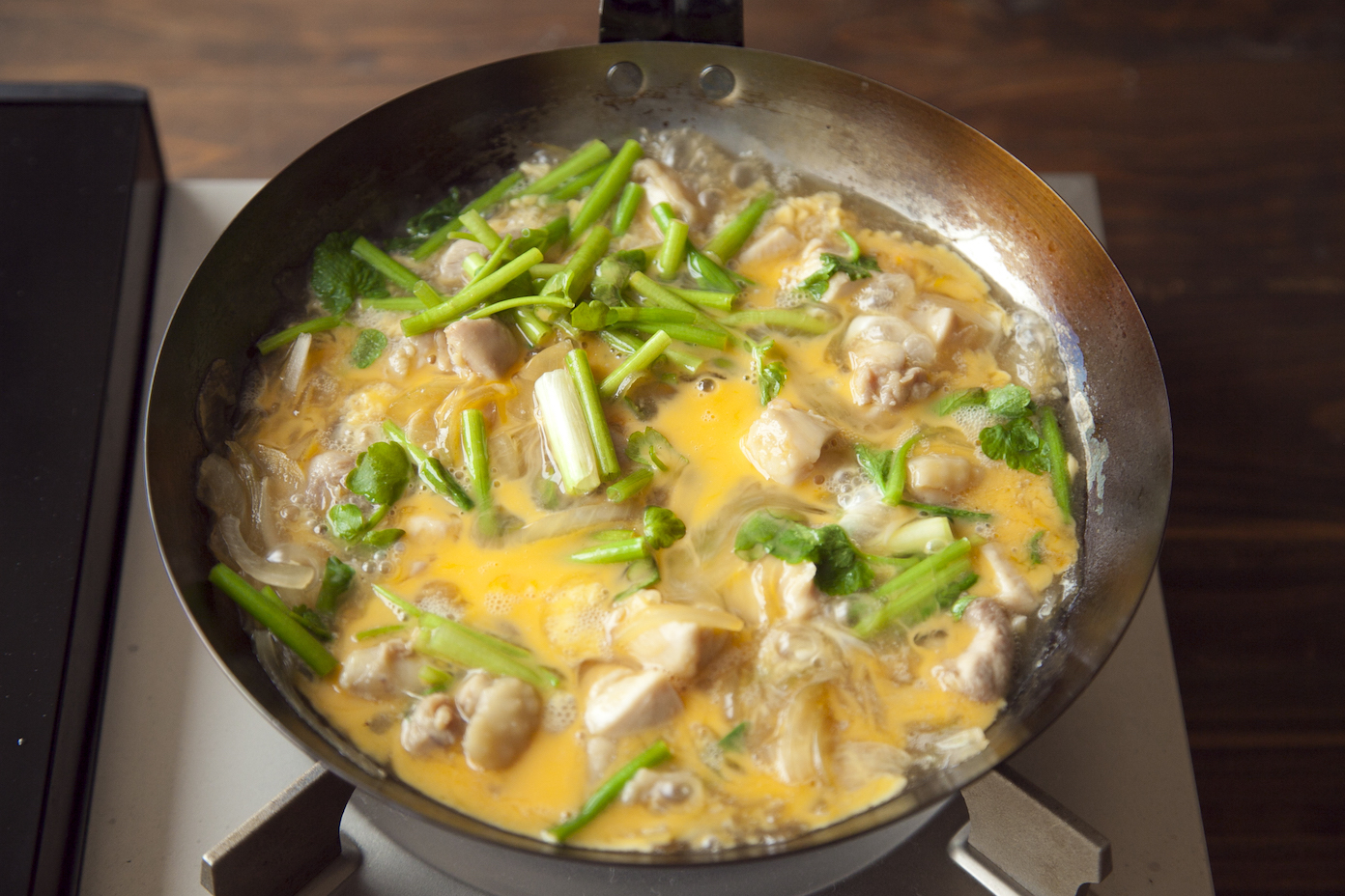 玉ねぎがしんなりとして鶏肉に火が通ったら、 せりを加え混ぜ、すぐに卵を加える。卵が半熟になったら、 ごはんを盛った器に盛り付ける。