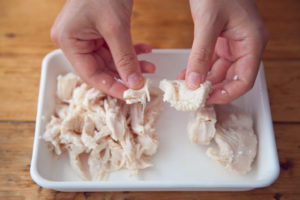 ささみを取り出し、ナンプラーを加える。ささみの粗熱を取り手で裂く。