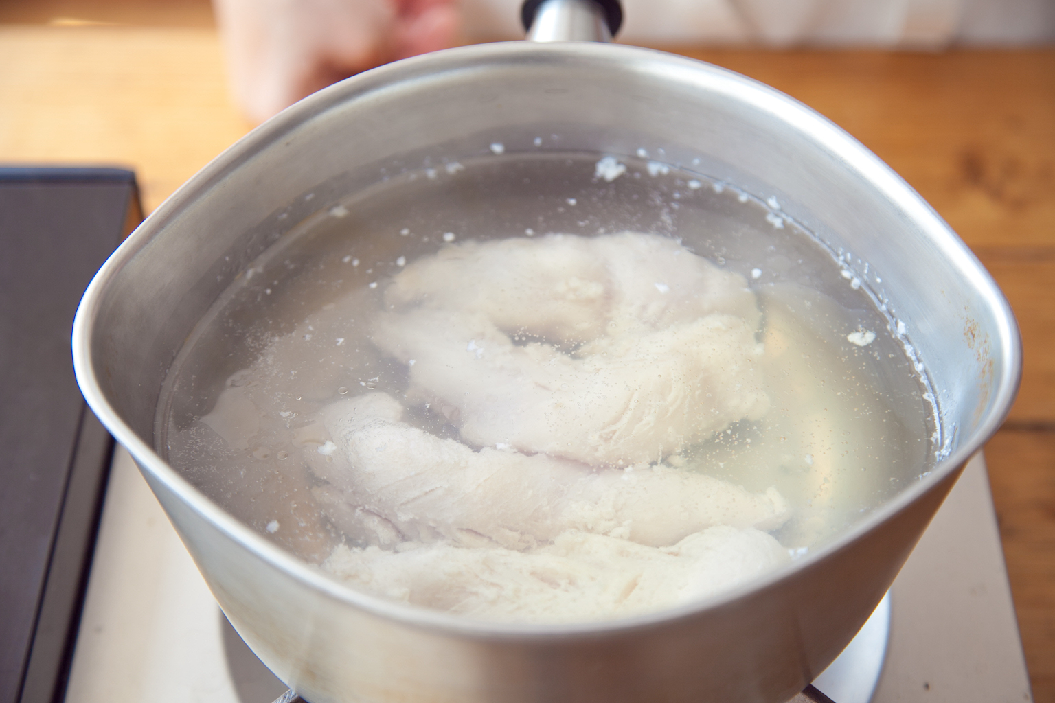 鍋に水4カップを入れて中火にかけ、煮立ったらごま油、ささみを塩麹ごと入れ、すぐ火を止める。