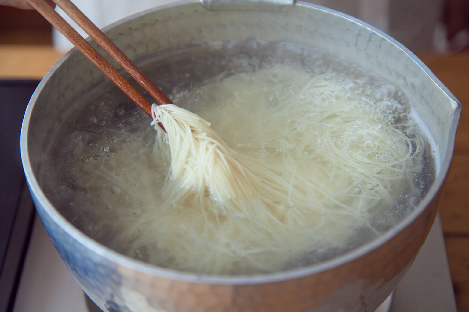 別の鍋に湯を沸かしてそうめんをやや硬めに茹で、ざるにあげて流水でぬめりを洗い流す。