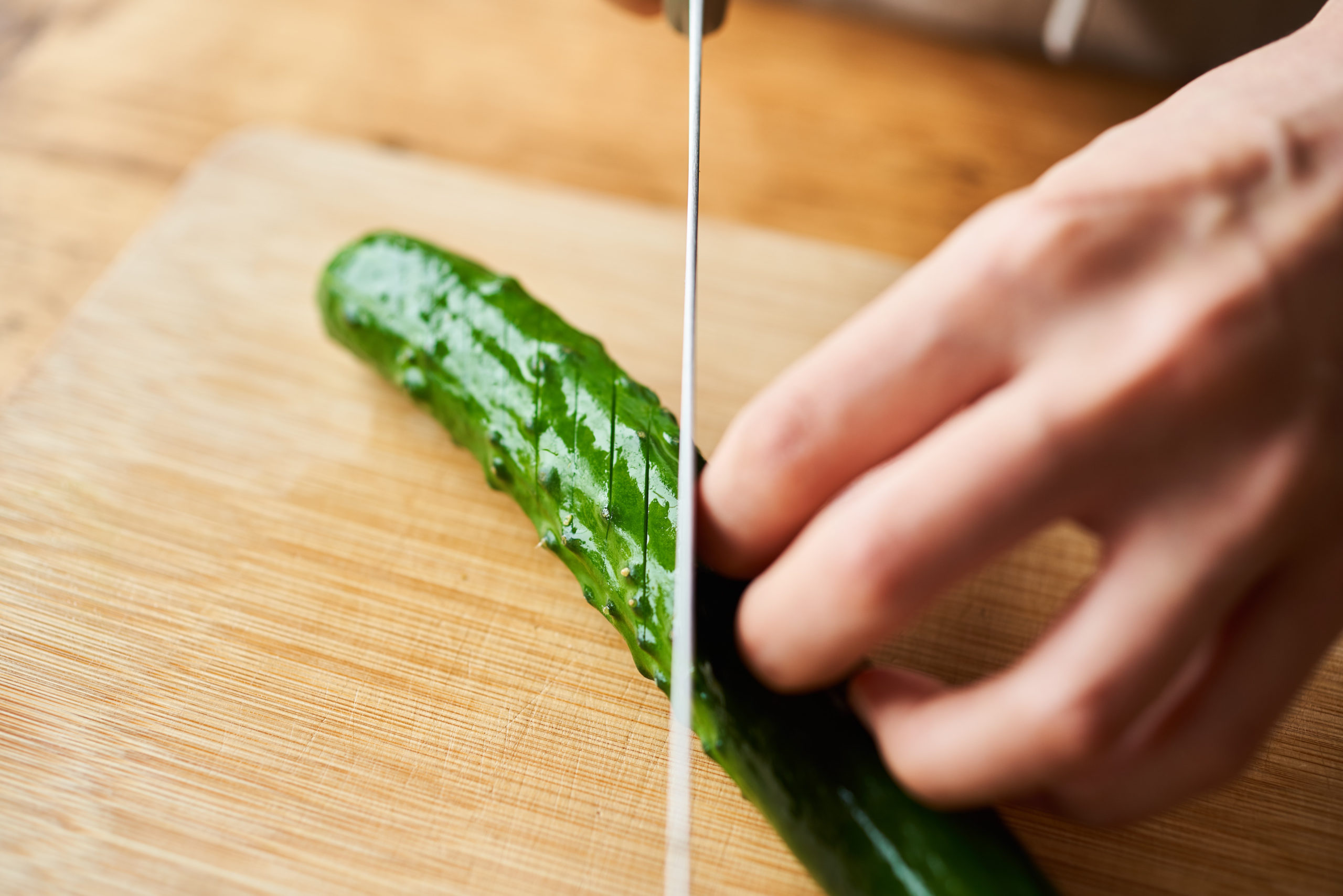 きゅうりは両端を切り落とし、斜めに1cmほどの深さで切り込みを入れる。