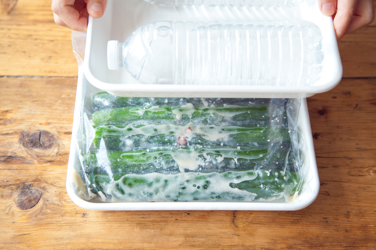 1kgの重石をのせて冷蔵庫に一日おく。箸を刺す。