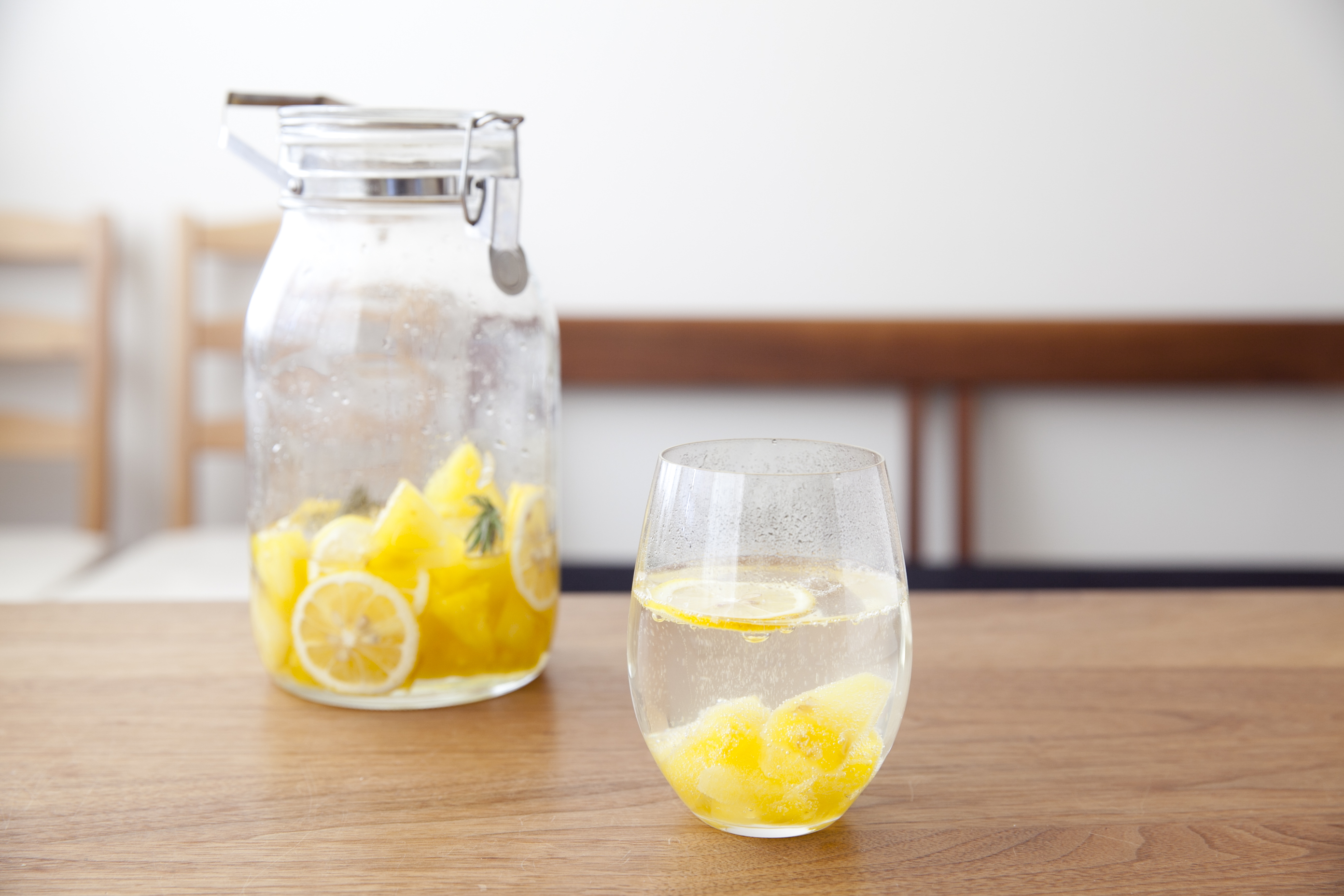 瓶にパイナップル、レモン、氷砂糖、ローズマリーを重なるように入れ、最後に1のレモン果汁を加える。