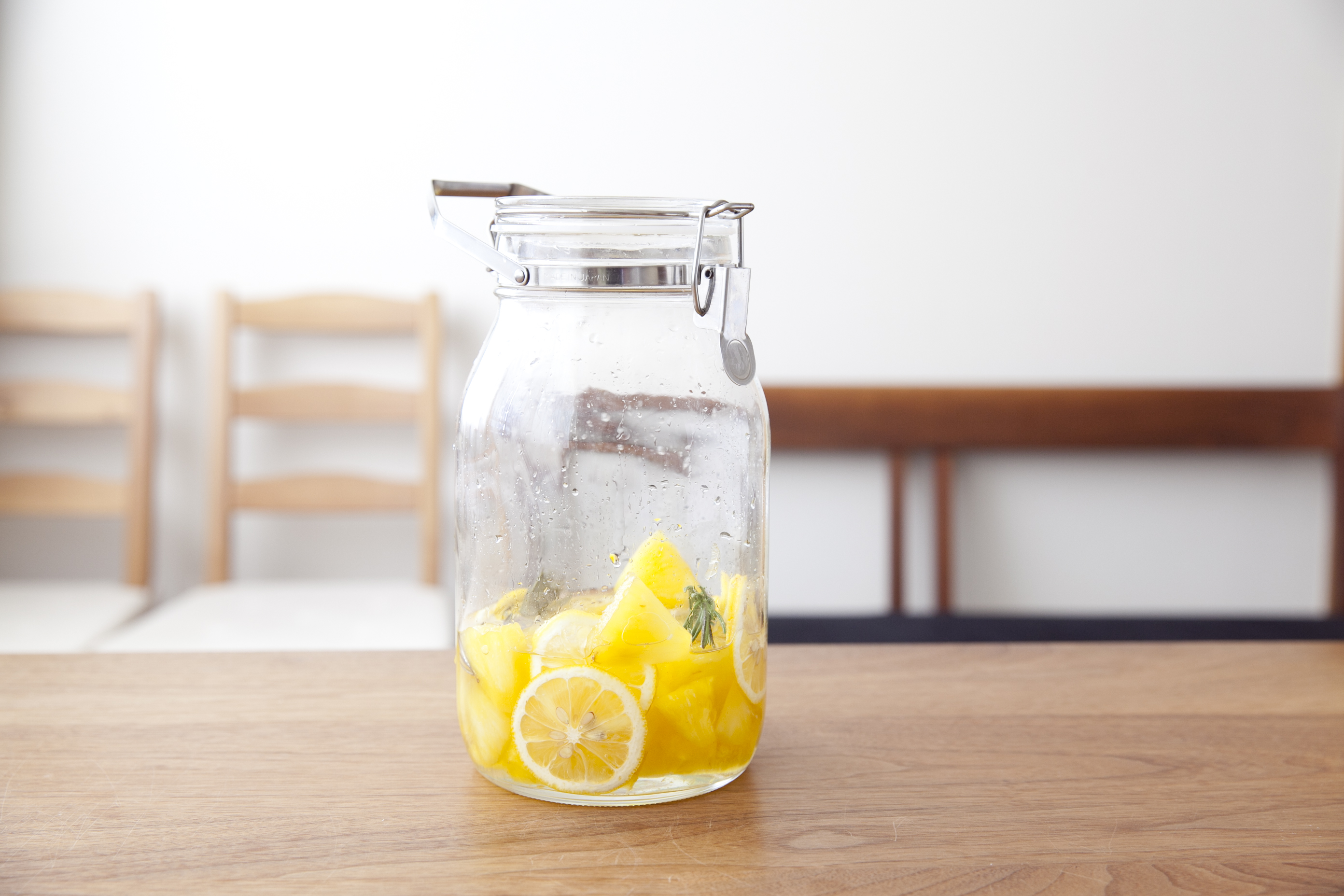 瓶にパイナップル、レモン、氷砂糖、ローズマリーを重なるように入れ、最後に1のレモン果汁を加える。