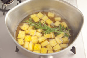 鍋にパイナップル、ラカントS(顆粒)、ローズマリー、水1カップを鍋に入れて中火にかけ、