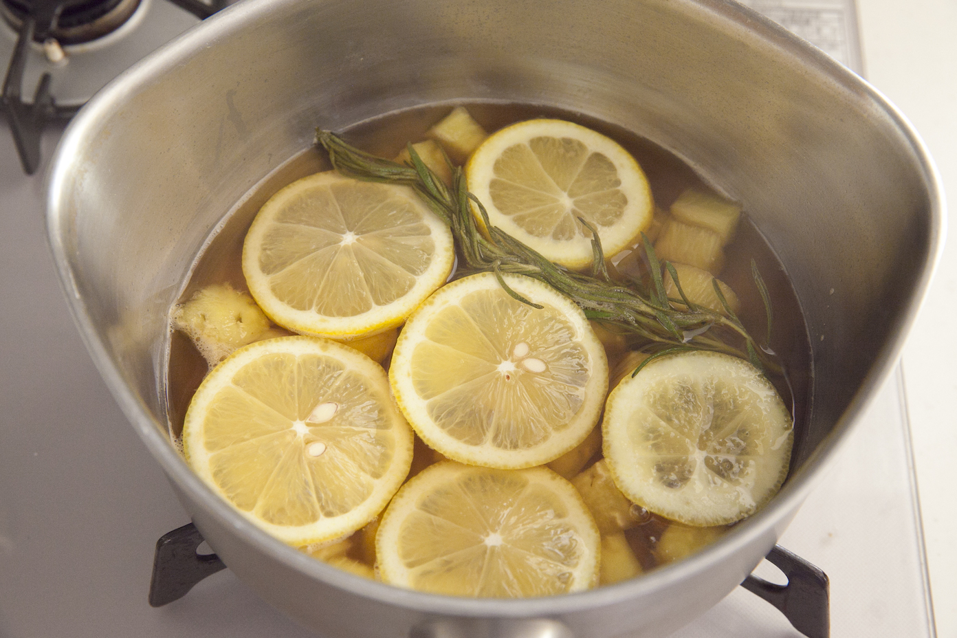 火を止めてレモンを加え、粗熱が取れたら清潔なビンに移して冷蔵庫でよく冷やす。